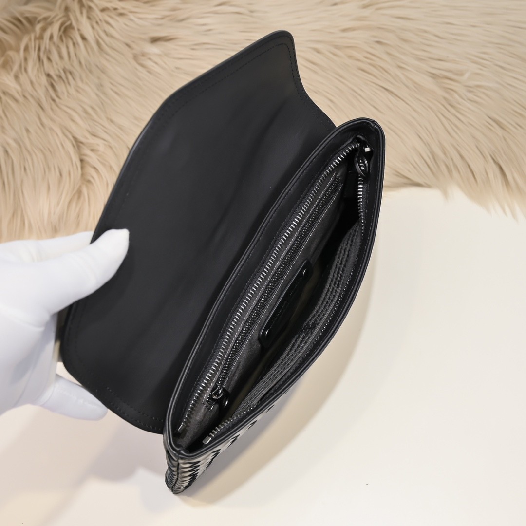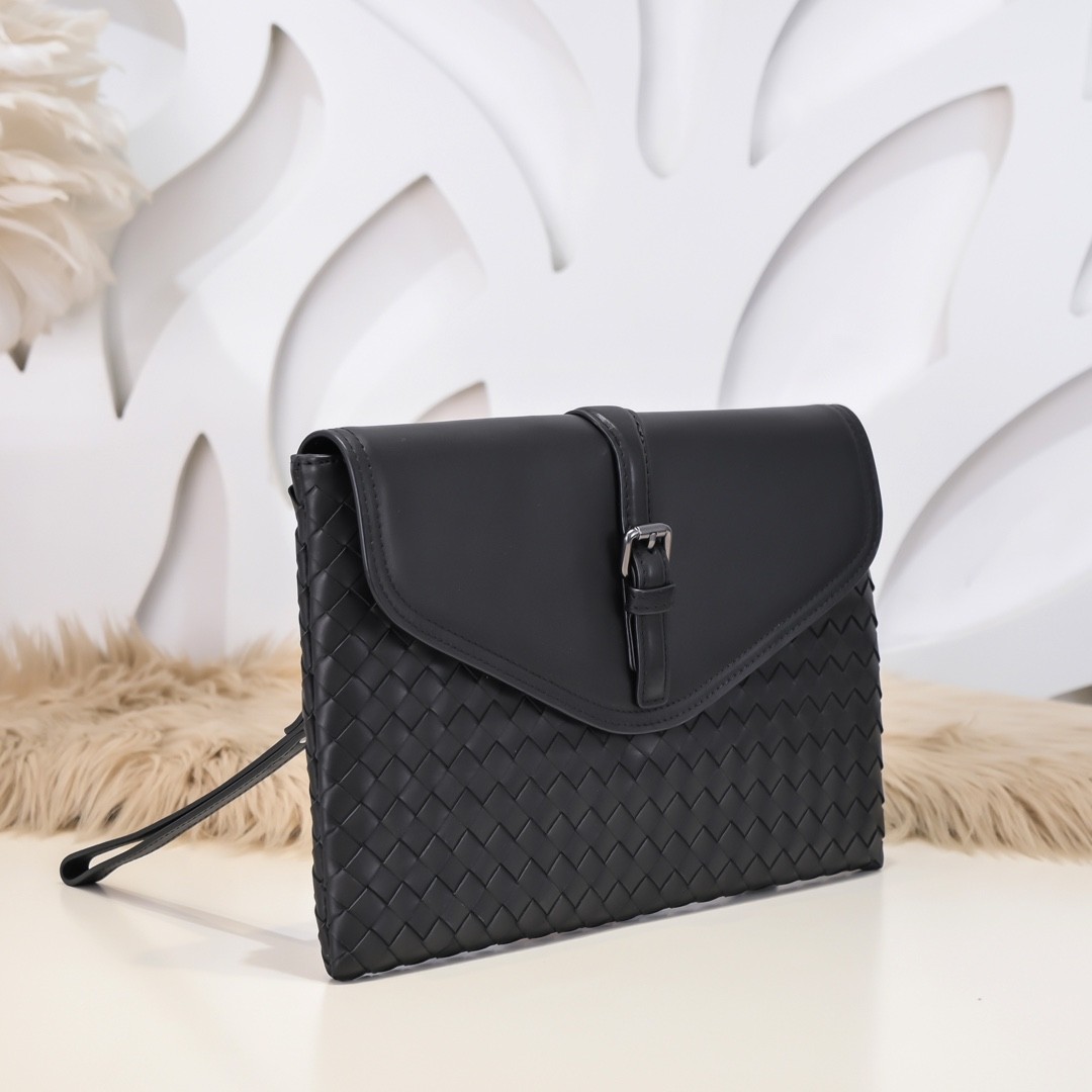 【BOTTEGA VENETA 寶緹嘉】Intrecciato 扣帶信封手拿包|黑色編織 × 真皮拼接 × 義式簡約風