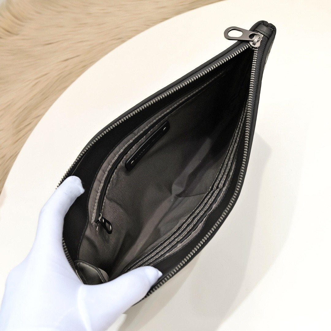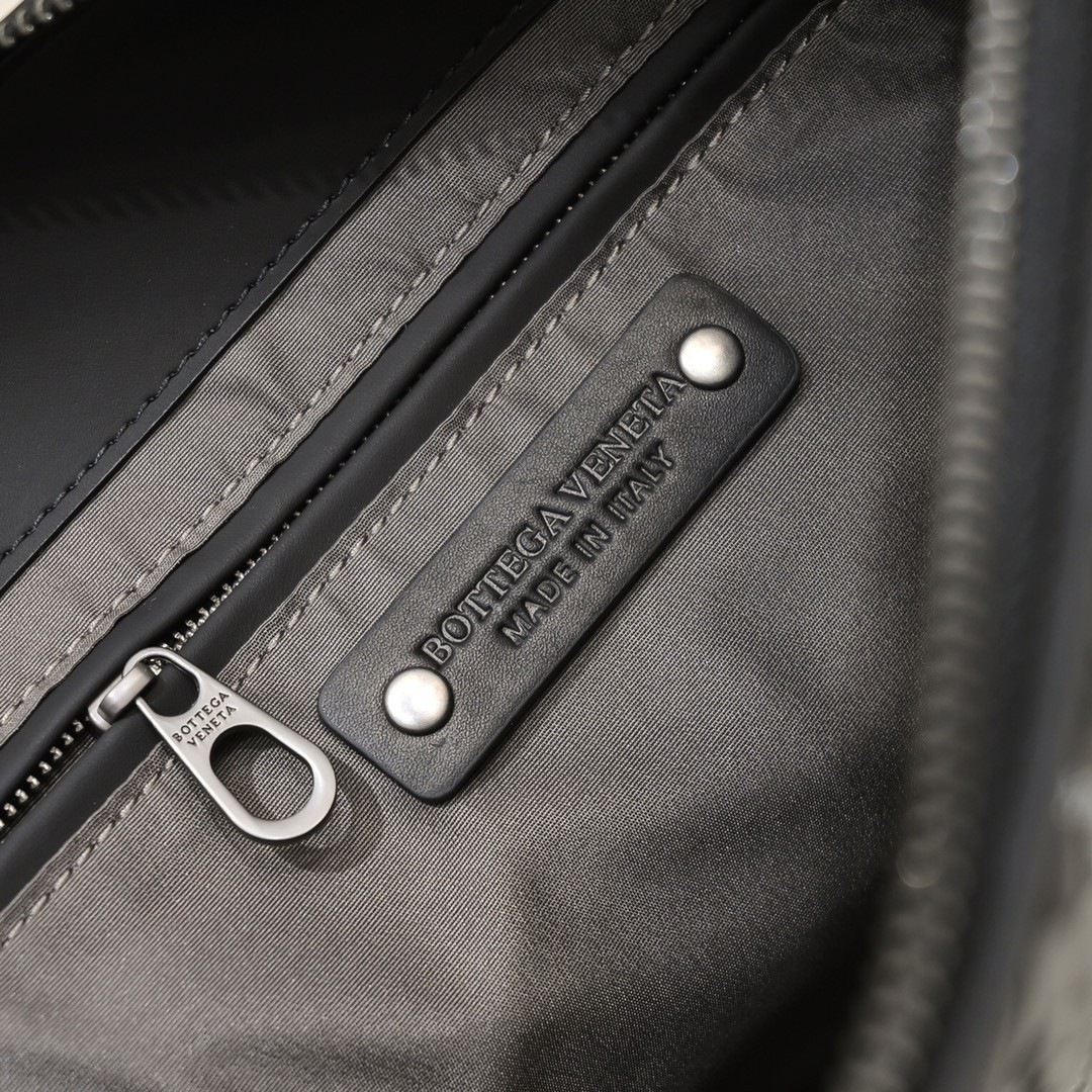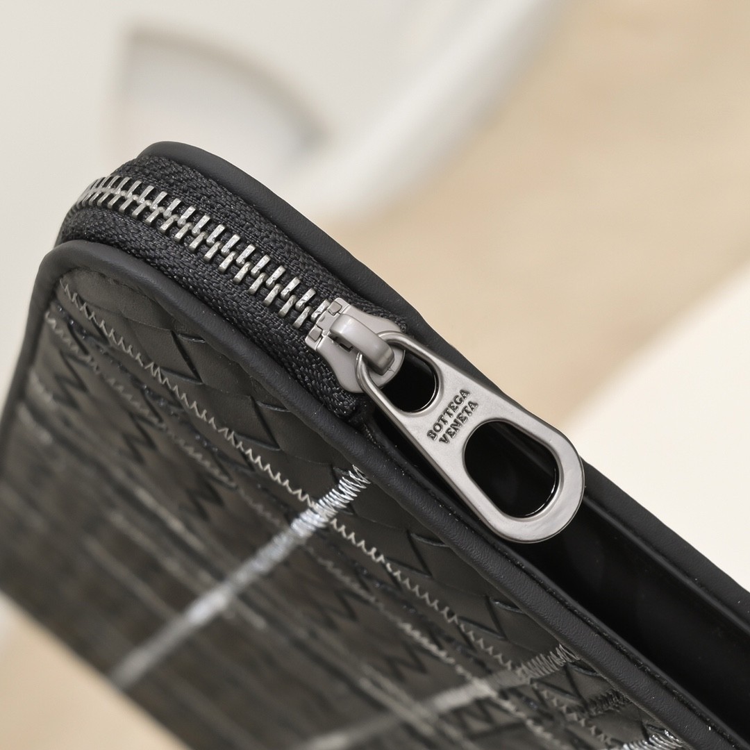 【BOTTEGA VENETA 寶緹嘉】Intrecciato 條紋拼接手拿包|黑灰編織 × 金屬拉鍊 × 精品質感
