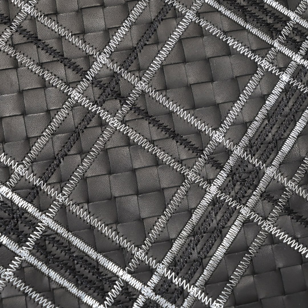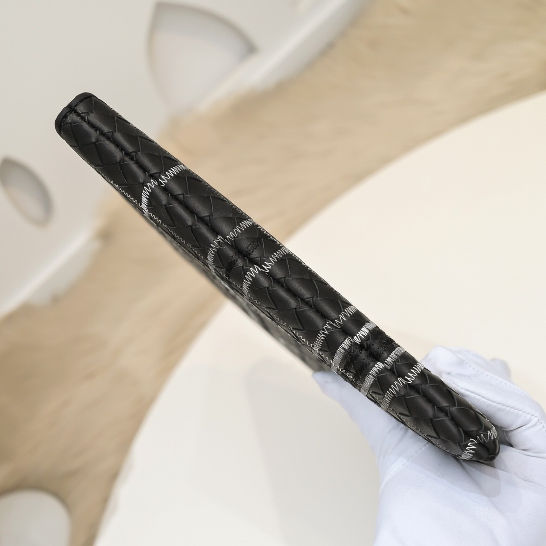 【BOTTEGA VENETA 寶緹嘉】Intrecciato 幾何刺繡手拿包|黑色編織 × 精緻格紋線繡 × 都會精品