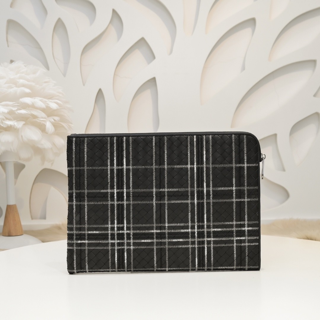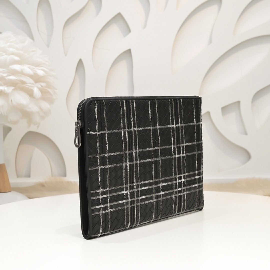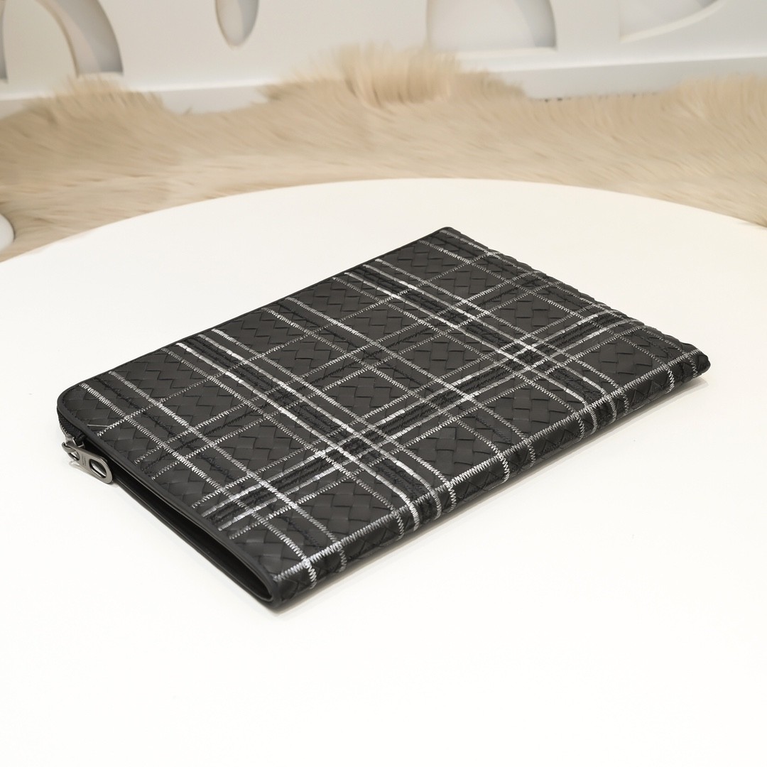 【BOTTEGA VENETA 寶緹嘉】Intrecciato 格紋刺繡手拿包|黑白交織 × 義式工藝 × 都會精品