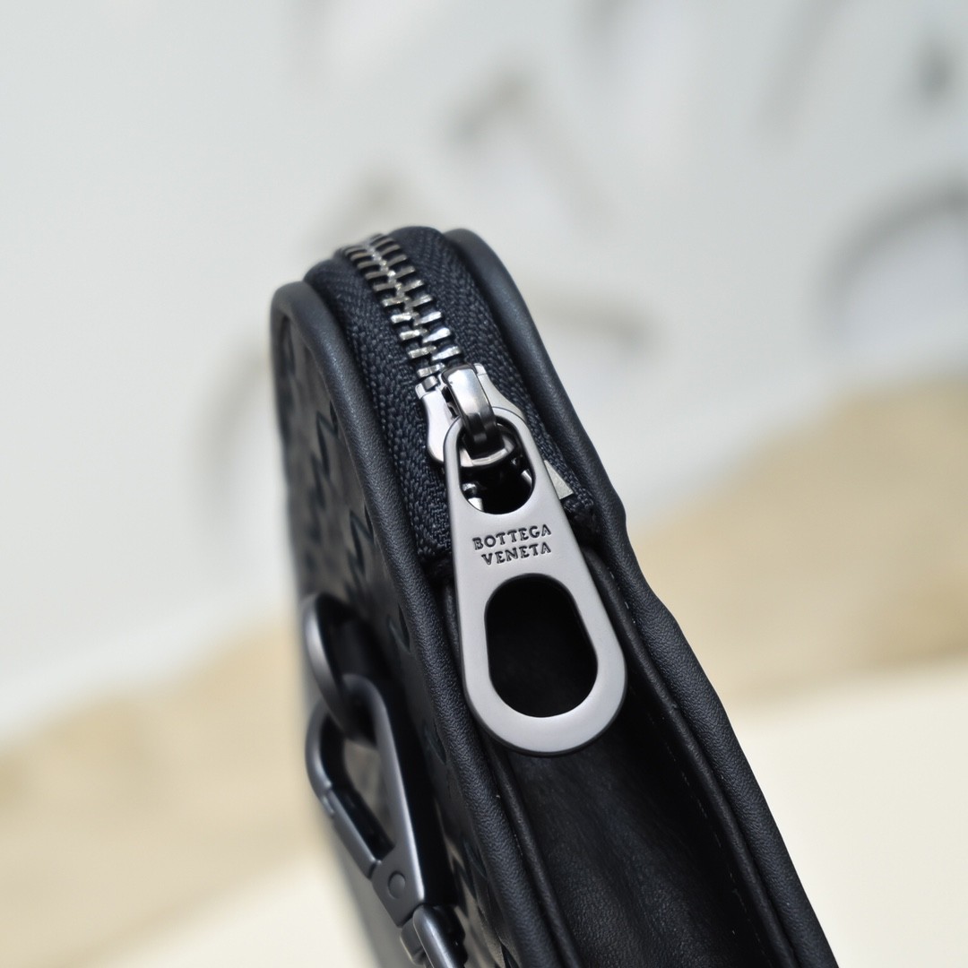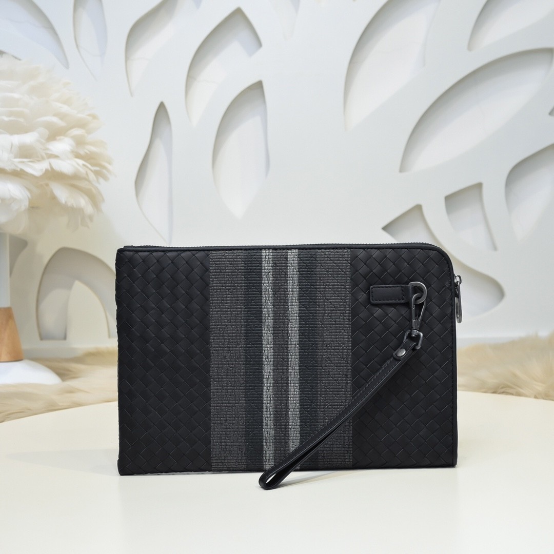 【BOTTEGA VENETA 寶緹嘉】Intrecciato 條紋拼接手拿包|黑灰編織 × 金屬拉鍊 × 精品質感