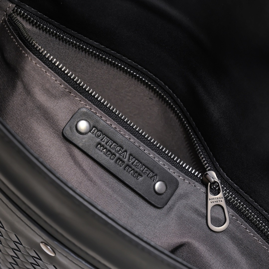 【BOTTEGA VENETA 寶緹嘉】Intrecciato 條紋拼接手拿包|黑灰編織 × 金屬拉鍊 × 精品質感