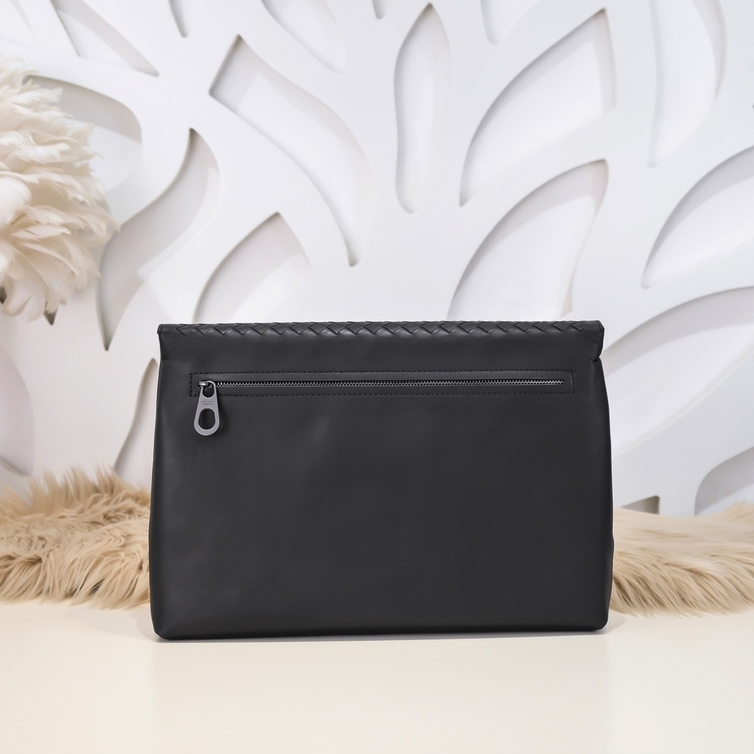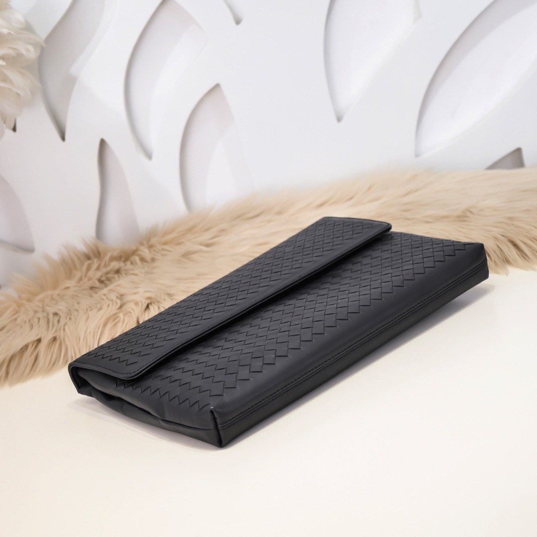 【BOTTEGA VENETA 寶緹嘉】Intrecciato 扣帶信封手拿包|黑色編織 × 真皮拼接 × 義式簡約風