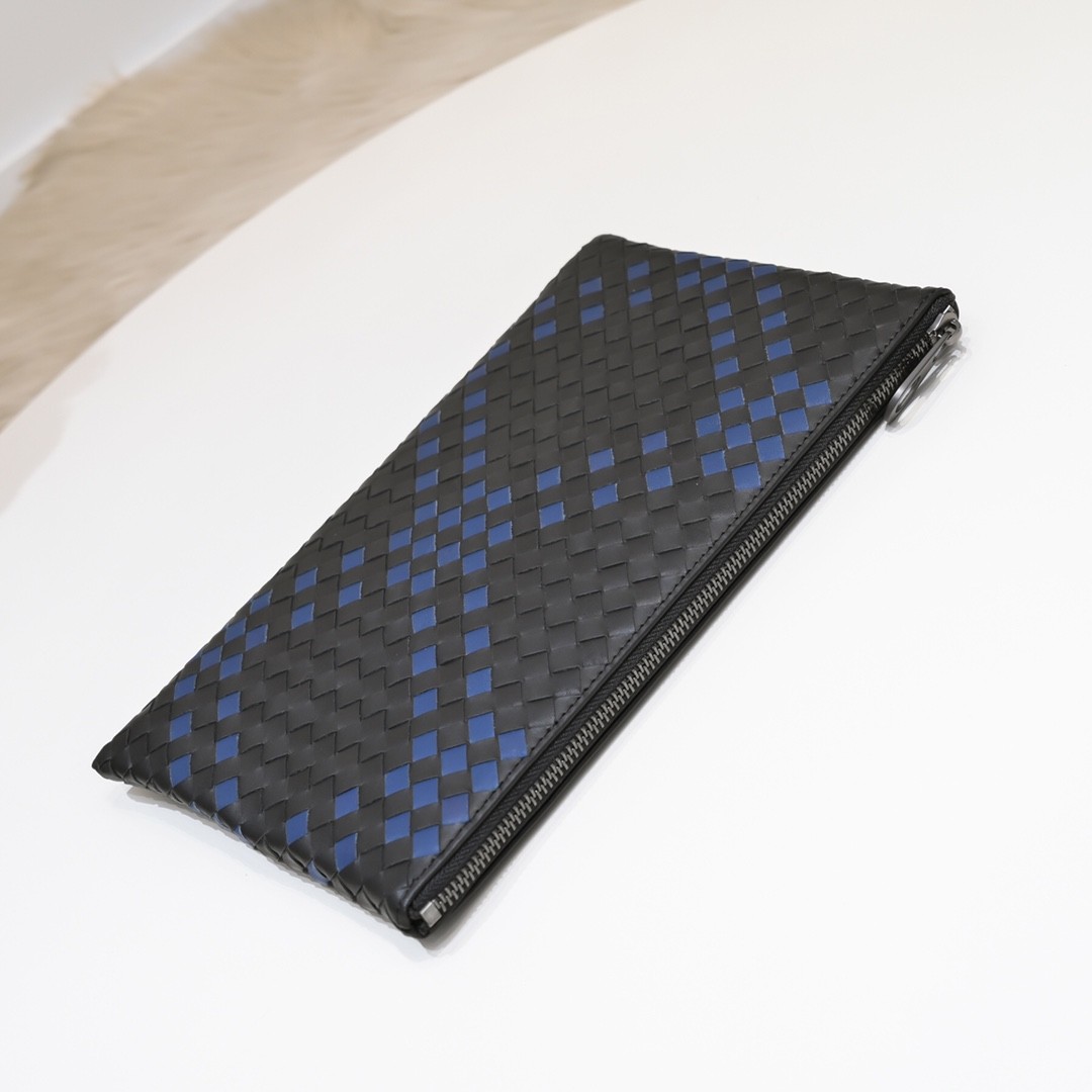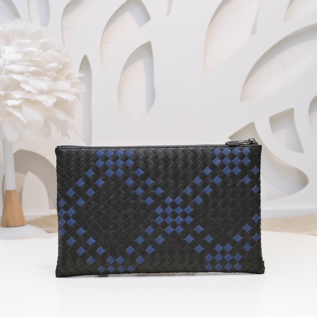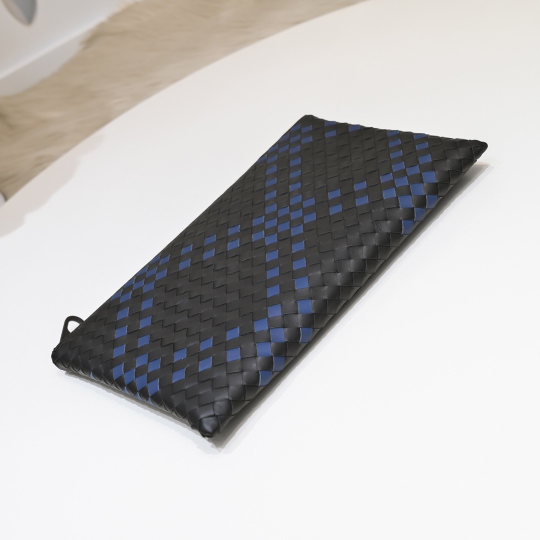 【BOTTEGA VENETA 寶緹嘉】Intrecciato 格紋藍黑手拿包|幾何撞色 × 手工編織 × 都會精品風