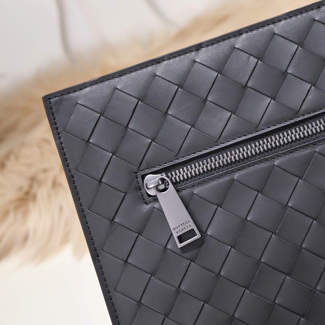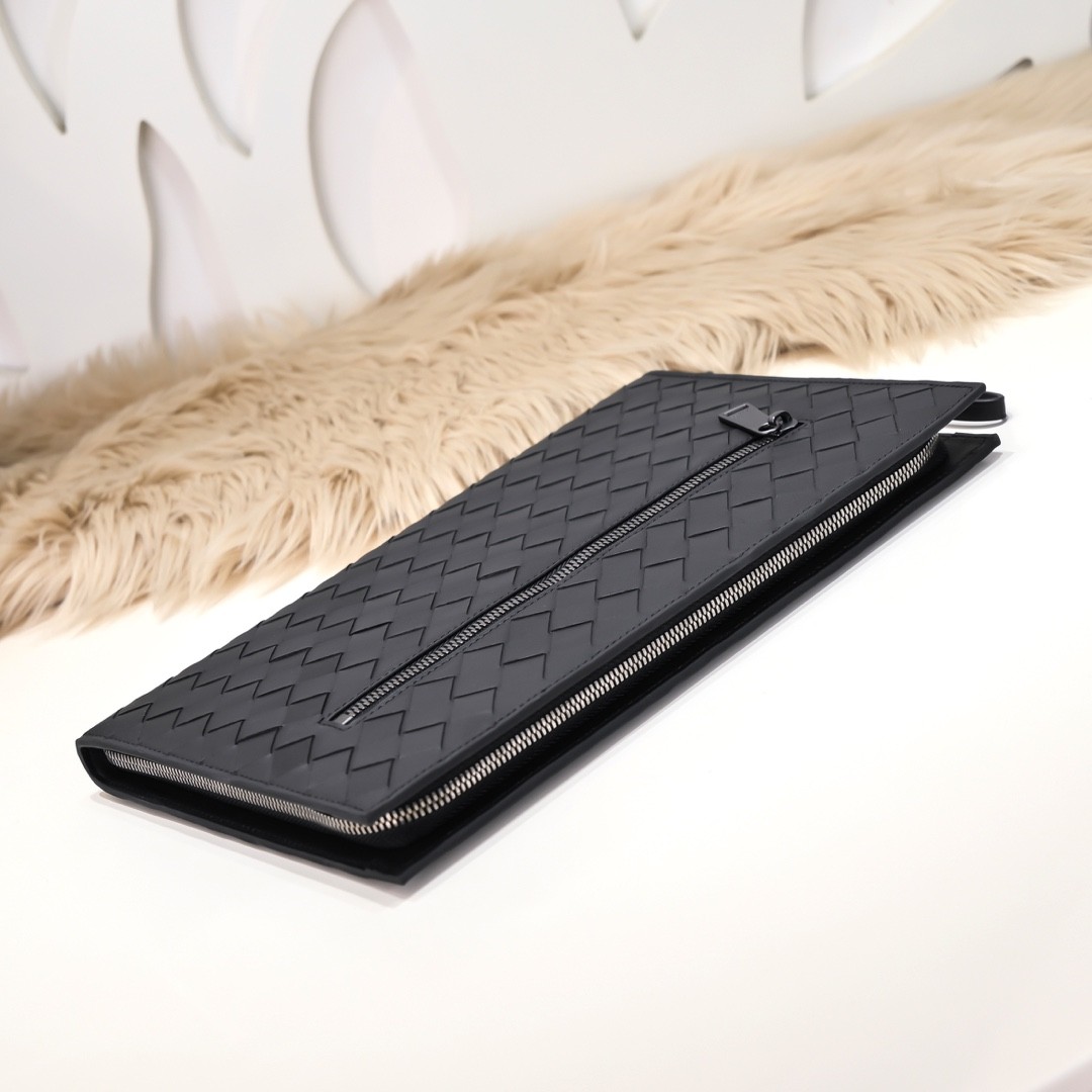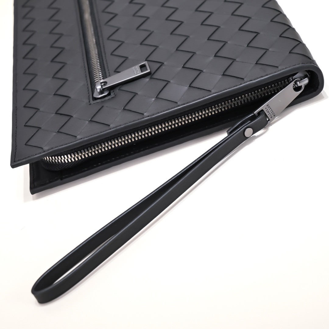 【BOTTEGA VENETA 寶緹嘉】Intrecciato 編織拉鍊手拿包|霧黑牛皮 × 前袋設計 × 商務休閒百搭款