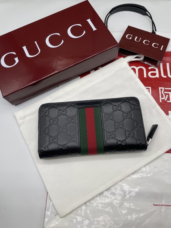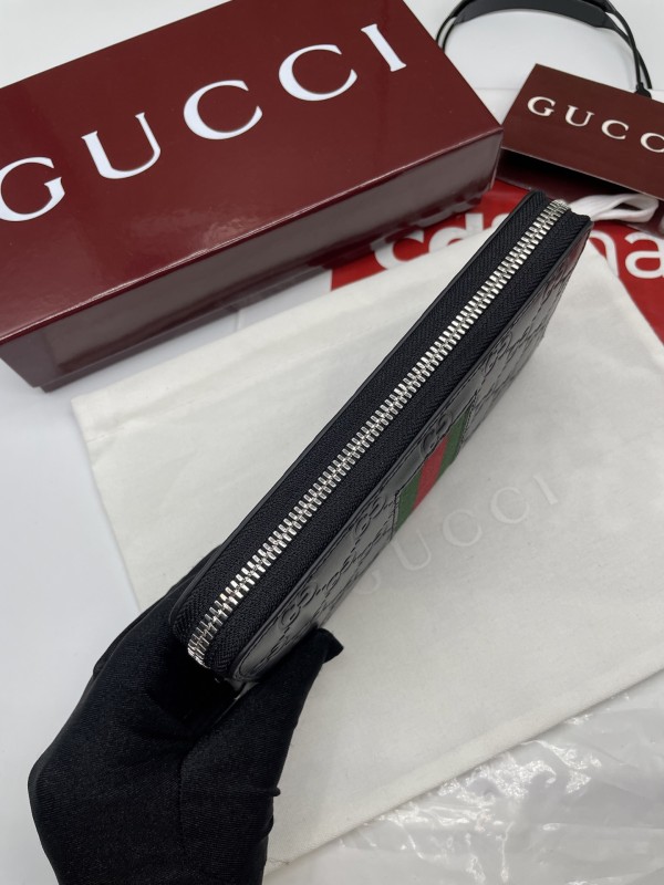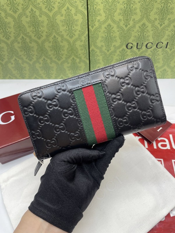 【GUCCI 古馳】雙G壓紋長夾(黑綠紅條)|經典皮革壓紋、綠紅織帶裝飾、全拉鍊收納設計