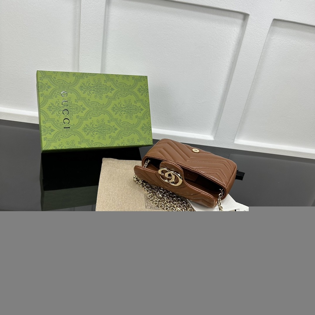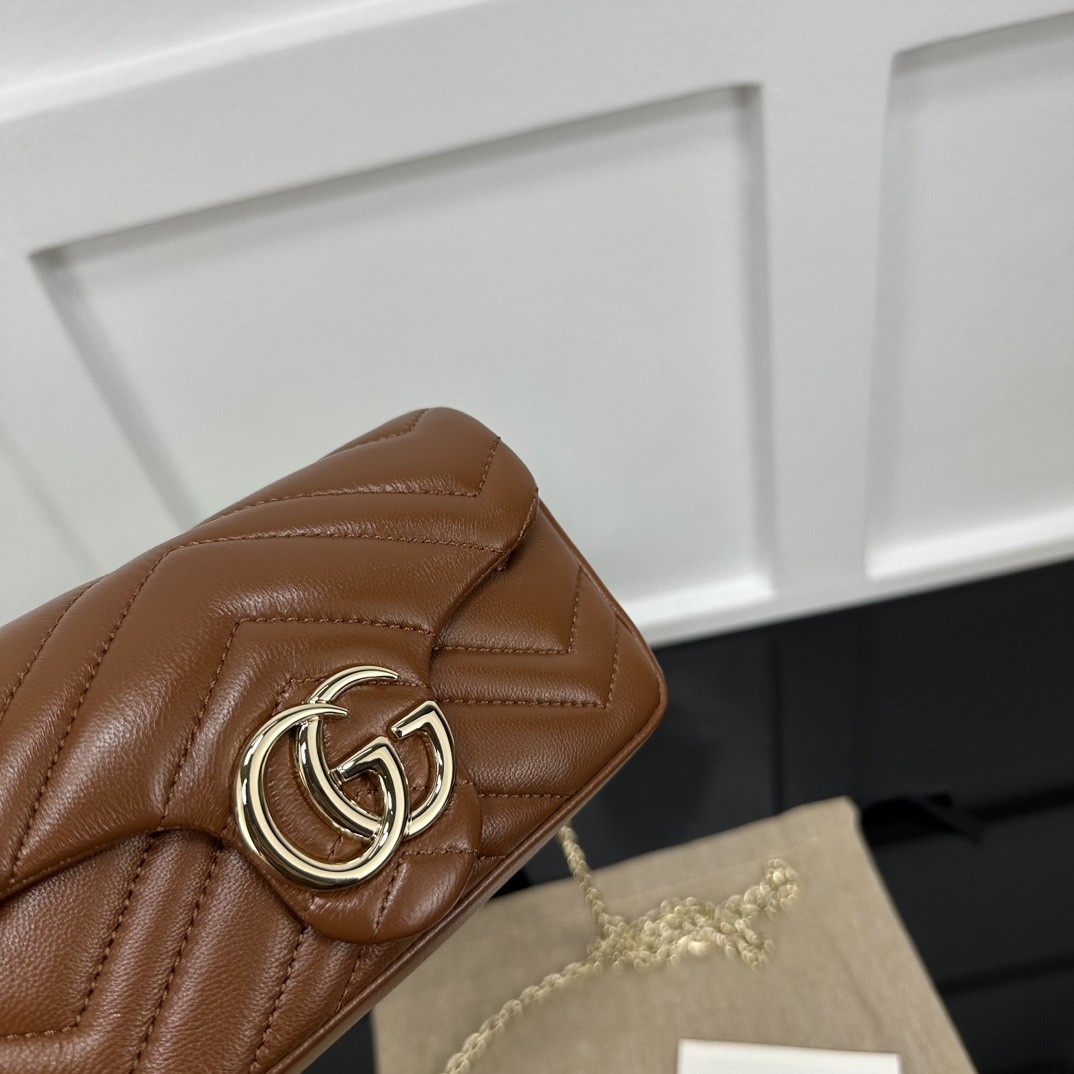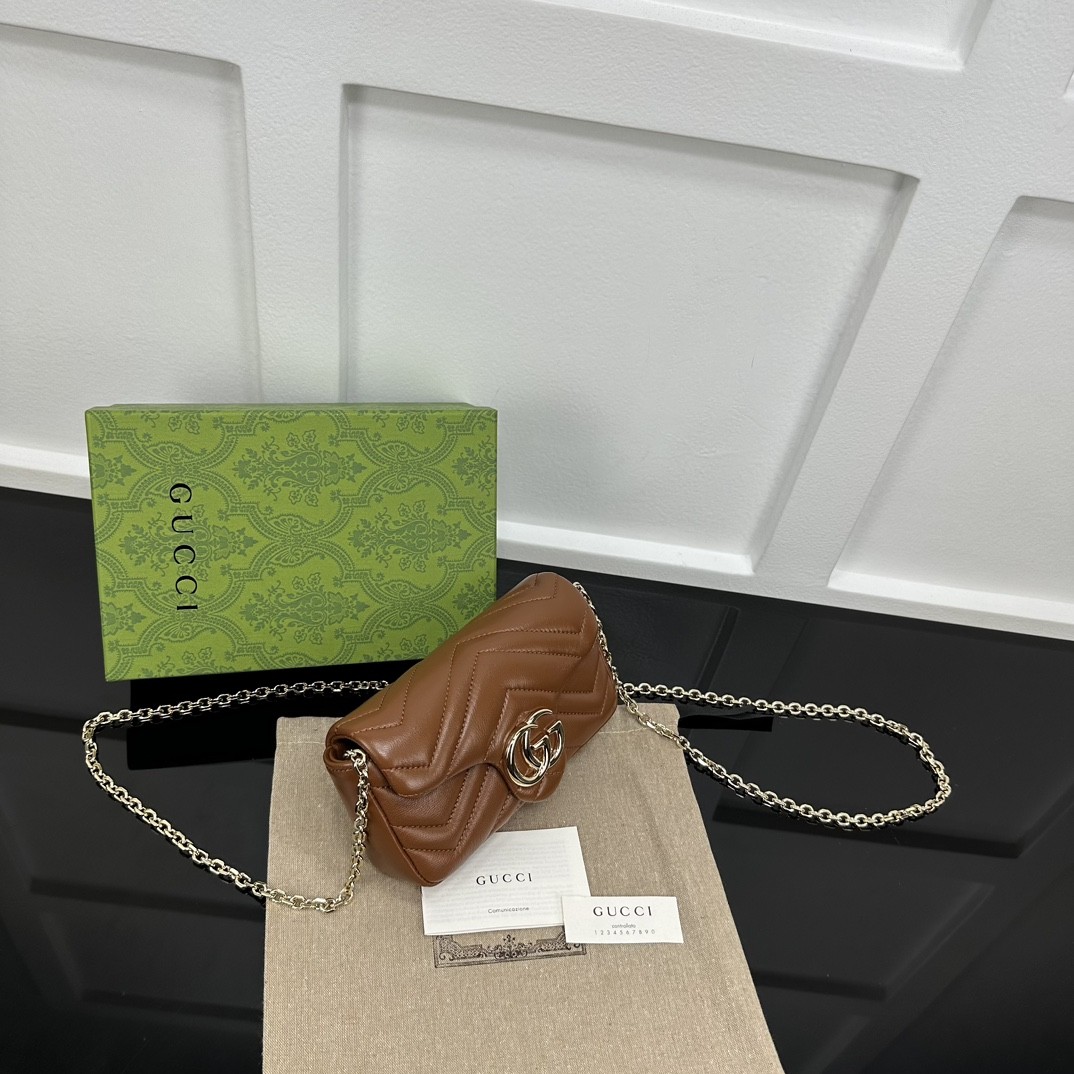【GUCCI 古馳】GG Marmont 迷你鏈條包|焦糖棕牛皮 × 雙G金扣 × 小香風鏈條設計