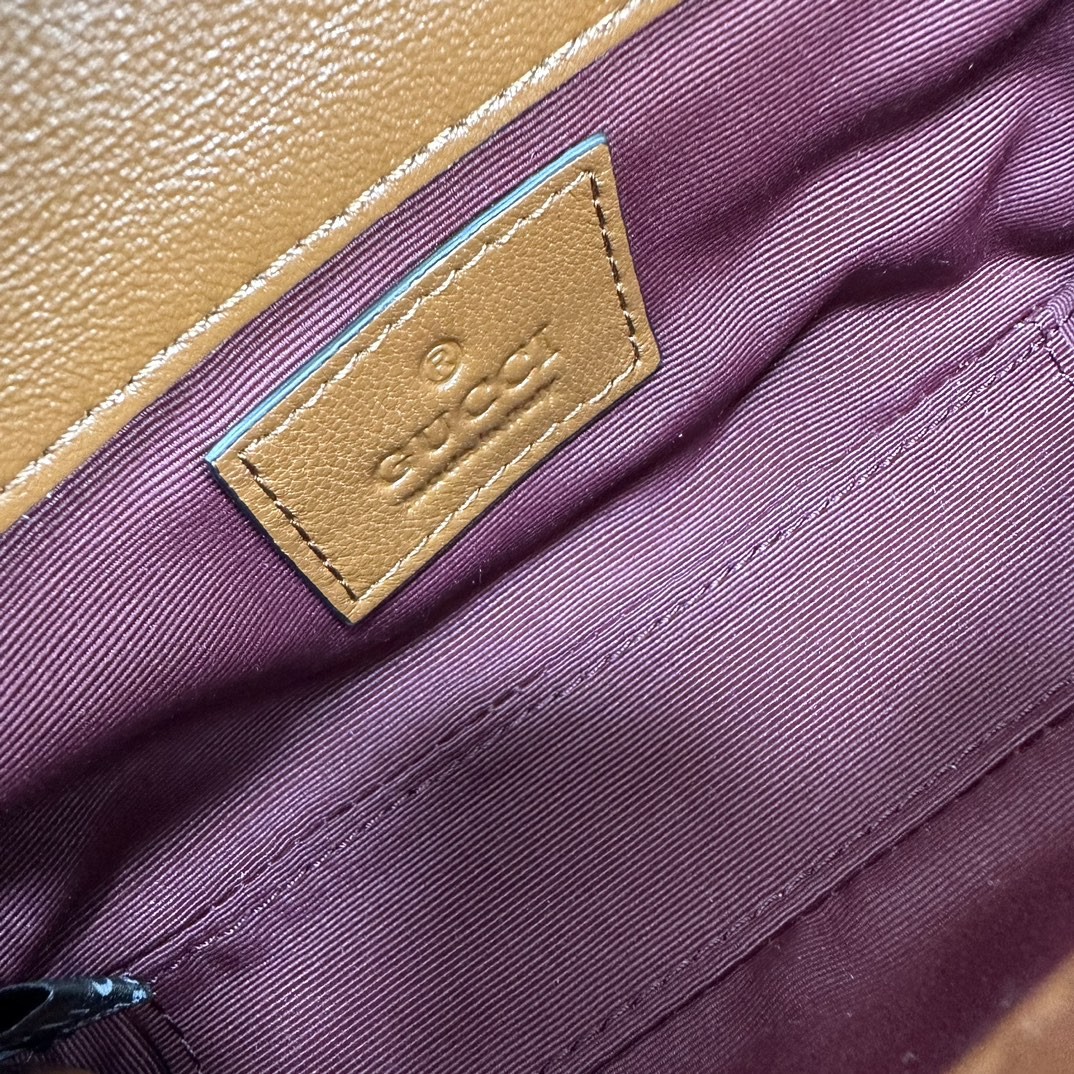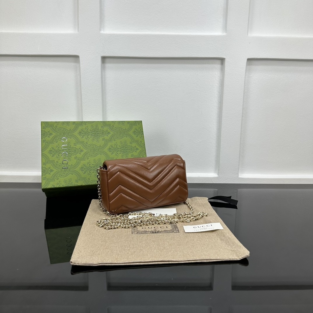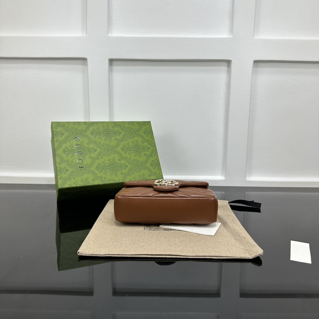 【GUCCI 古馳】GG Marmont 迷你鏈條包|焦糖棕牛皮 × 雙G金扣 × 小香風鏈條設計