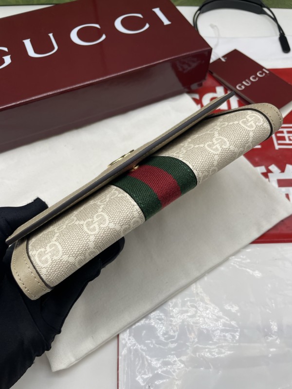 【GUCCI 古馳】GG Supreme 經典帆布長夾(米色織帶款)|金色雙G標誌、綠紅織帶、翻蓋式大容量設計