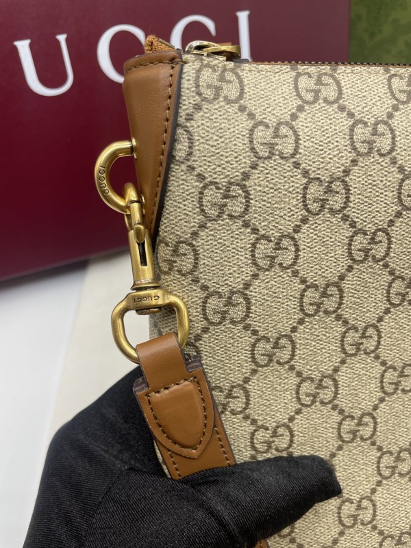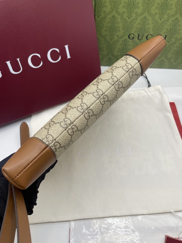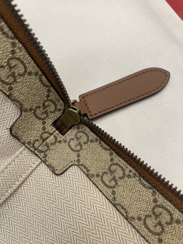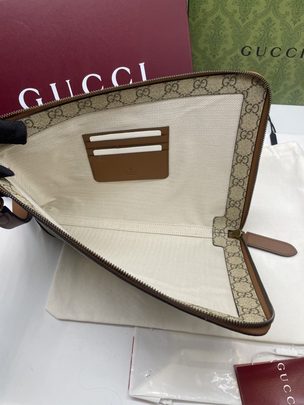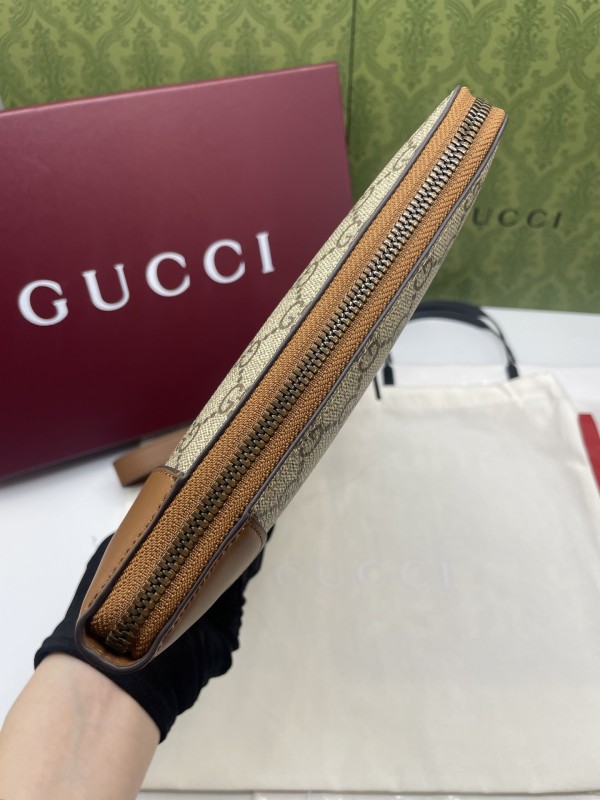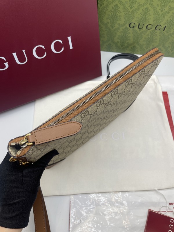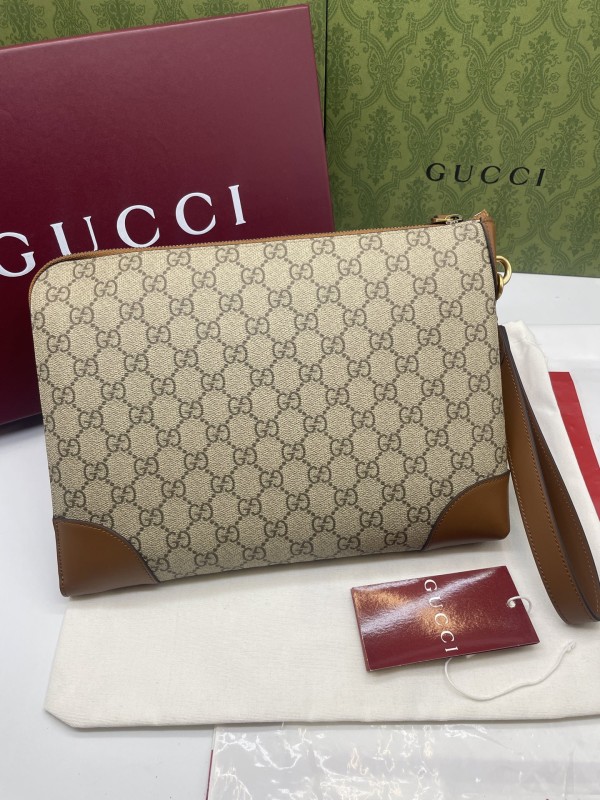 【GUCCI 古馳】GG Supreme 卡其焦糖拼皮手拿包|經典雙G帆布 × 焦糖皮飾邊 × 復古質感風