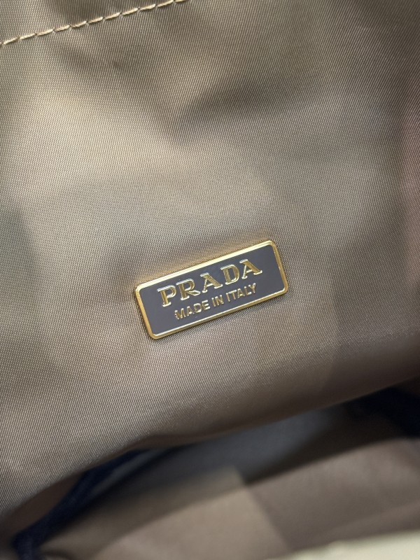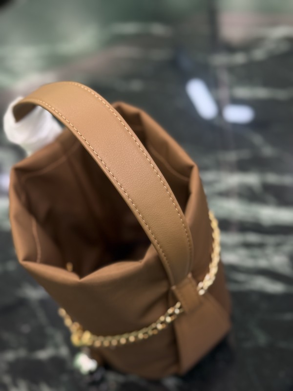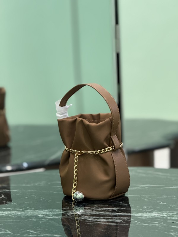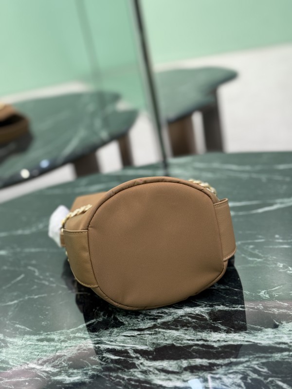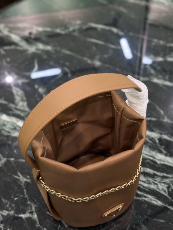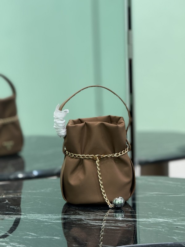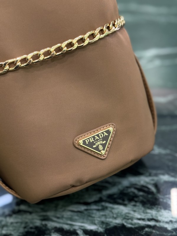 【PRADA 普拉達】Re-Nylon 鍊條水桶包|焦糖棕 × 金鍊裝飾 × 三角Logo輕奢設計
